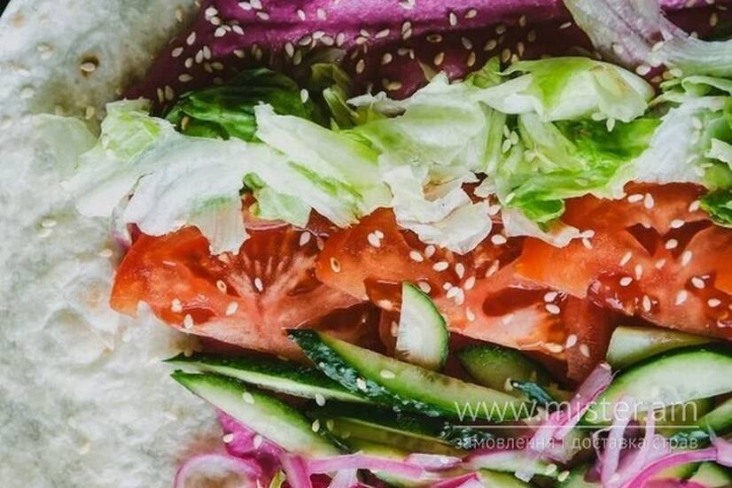 Лаваш, хумус, салат айсберг, помідор, огірок, маринова цибуля, смажений кунжут.