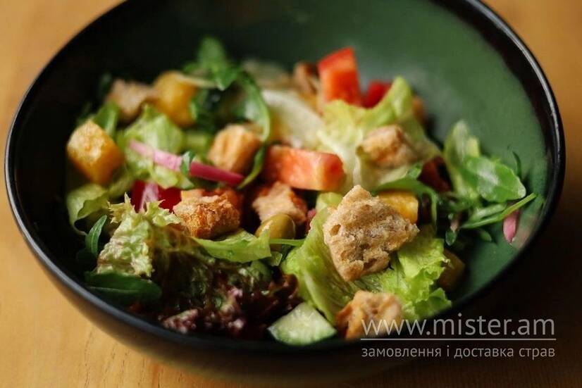 Салат айсберг, мікс листя салату, огірок, помідор, болгарський перець, апельсин, оливки, в`ялені томати, маринова червона цибуля, грінки, лимонний сік, оливкова олія, італійські трави.