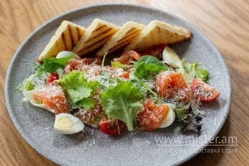 Салат айсберг, мікс листя салату, сьомга слабосолена (сьомга, сіль, цукор), томати черрі, перепелині яйця, сир Грано Падано, бріош (яйця курячі, цукор, сіль. олія соняшникова рафінова, молоко, масло вершкове, дріжджі, борошно пшеничне), білий соус (яйця курячі, олія соняшникова рафінована, часник, соєвий соус, анчоуси, цукор, оцет, гірчиця американська).