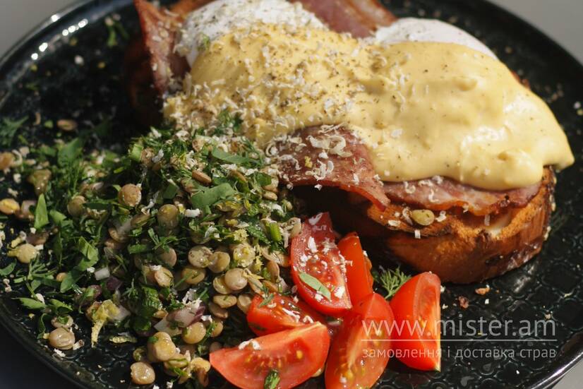 Яйця пашот, хліб хала, бекон смажений, сирний соус (молоко, вершки, вершкове масло, сир Чедер, сир Белпер Кнолле, сир Грано Падано, борошно), печений буряк, сир Белпер Кнолле, чорний кунжут.