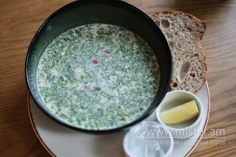 Індичка пастрамі, телятина печена, курка пастрамі, картопля, огірок, редис, яйця курячі, сметана, сироватка, гірчиця міцна, зелена цибуля, кріп, лимон, хліб на заквасці.