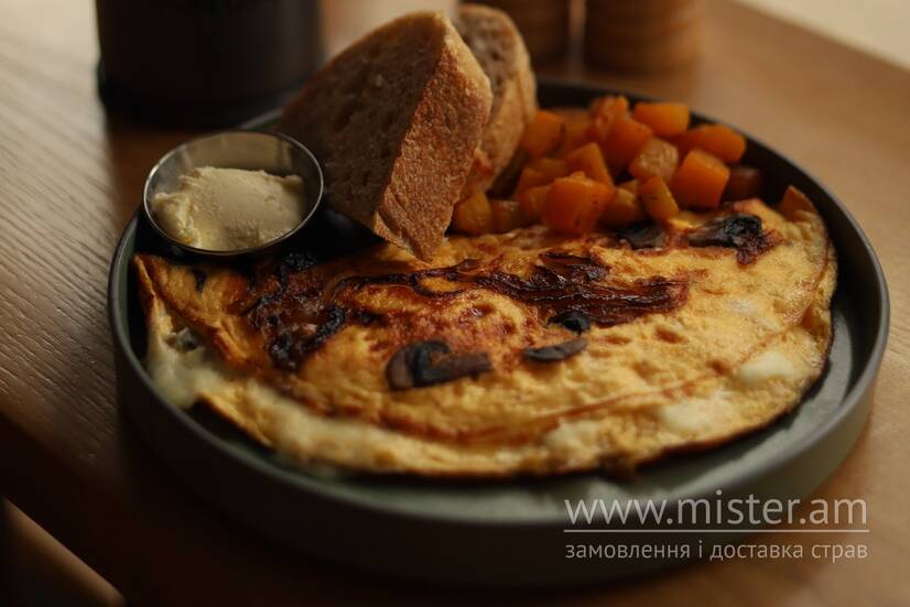 Омлет на сметані, смажені печериці, карамелізована цибуля (біла цибуля, соєвий соус, цукор), фермерський сир Моцарела, печений гарбуз, вершкове масло, хліб на заквасці.