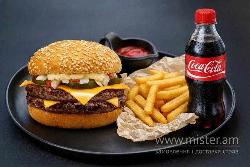 Подвійна котлета з телятини, огірок маринований, сир, кетчуп, майонез, картопля фрі, кетчуп, Кока-кола.