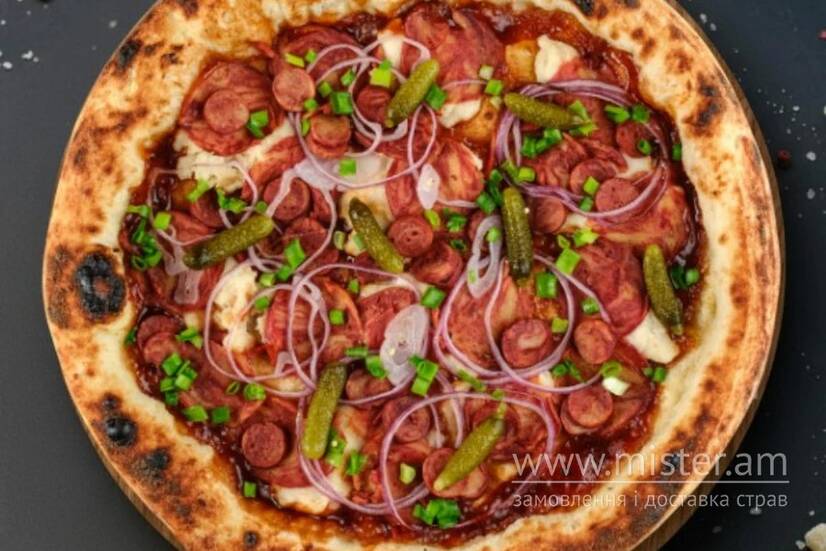 Томатний соус, мисливські ковбаски, салямі, мариновані огірки, цибуля, соус.
