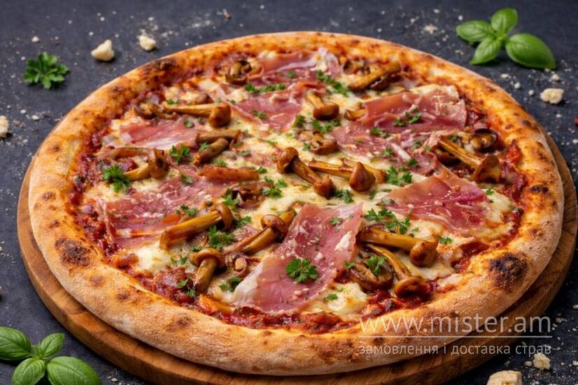 Томатний соус, моцарела, твердий сир, хамон, гриби опеньки, соус.