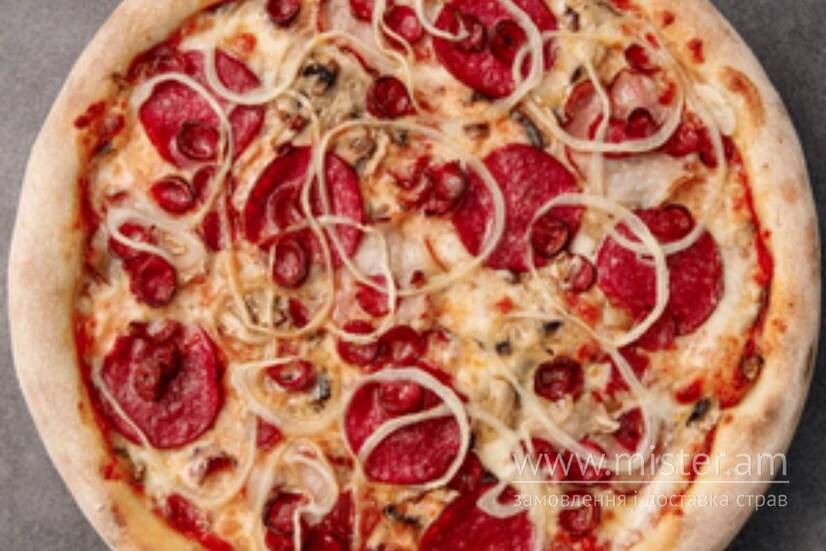Гострий соус, сир, бекон, мисливські ковбаски, салямі, печериці, маринована цибуля.