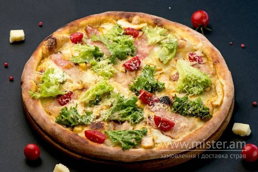 Вершковий соус, сир твердий, сир моцарела, бекон, куряче філе, помідори, мікс салатів, соус цезар, пармезан.