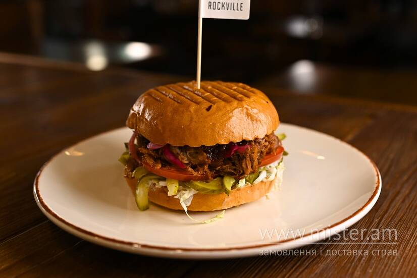 Булочка бріош, рвана свинина, пекінська капуста, помідор, мариновані огірки, маринована синя цибуля, соус BBQ, соус йогуртово-сметанний із зеленню.