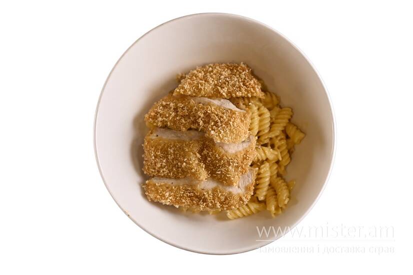 Макарони у вершково-сирному соусі із куркою кріспі.