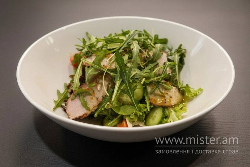 Салат айсберг, мікс листя салату, індичка пастрамі, томати черрі, огірок, медово-гірчична заправка з оливковою олією.