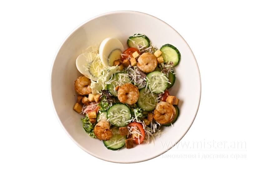 Мікс листя салату, креветки обсмажені в соєвому соусі, томати черрі, огірок, куряче яйце, сир Грано Падано, грінки, соус тартар.