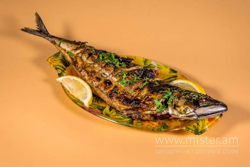 Скумбрія гриль, лаваш, лимон, зелень.