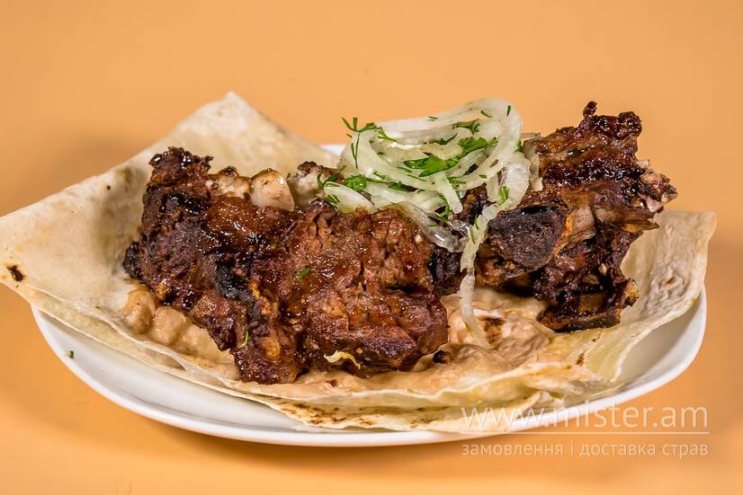 Телятина, лаваш, маринована цибуля.