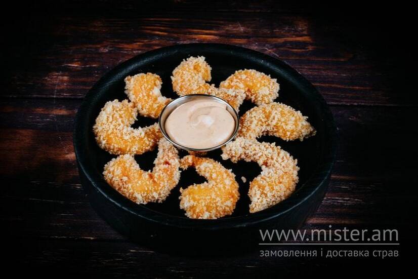 Тигрові креветки в паніровці з гострим майонезом.