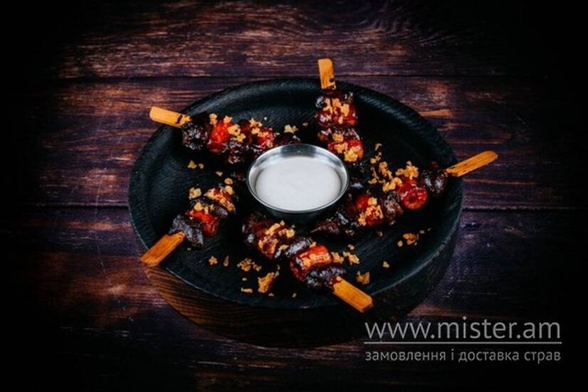 Шашличок з курячих сердець та бейбі моркви, копчений майонез.