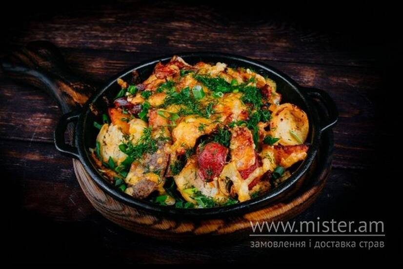 Картопля, ковбаски курячі та яловичі, мисливські ковбаски, сир, зелень та халапеньйо, цибуля марс.
