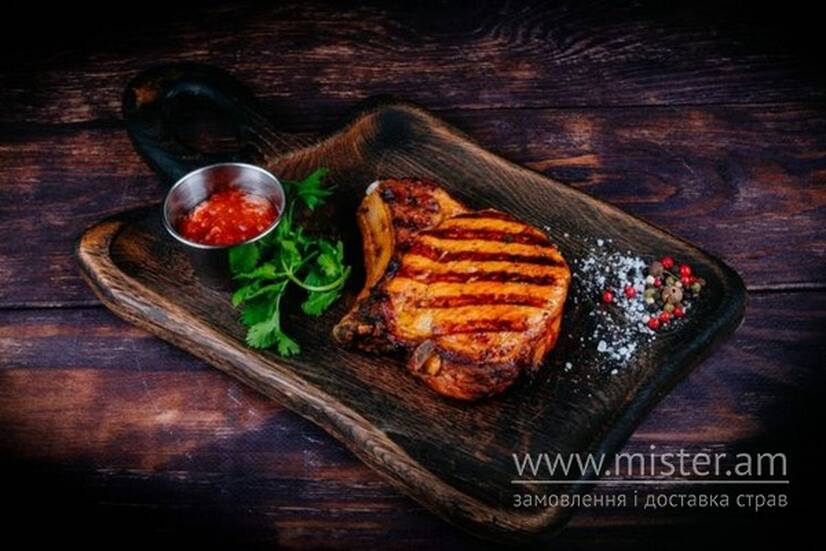 Антрекот зі свинини на кістці з пряною аджикою.