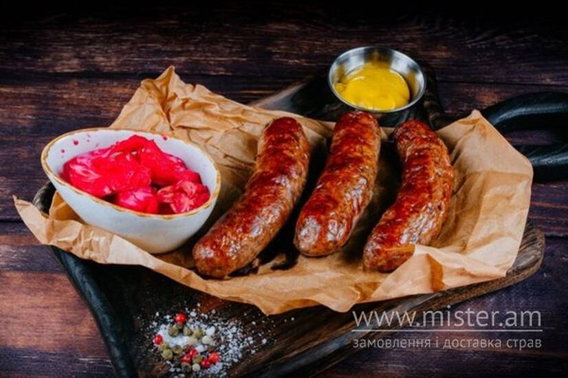 Домашні ковбаски з яловичини та свинини, гірчиця та маринована капуста.