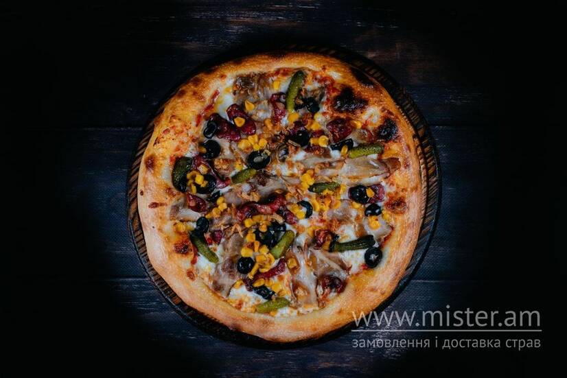 Томатний соус, моцарела, свиняче ребро з хосперу, ковбаски мисливські, корнішони, кукурудза, маслини, маринована червона цибуля та цибуля кріспі, подається з соусом BBQ.