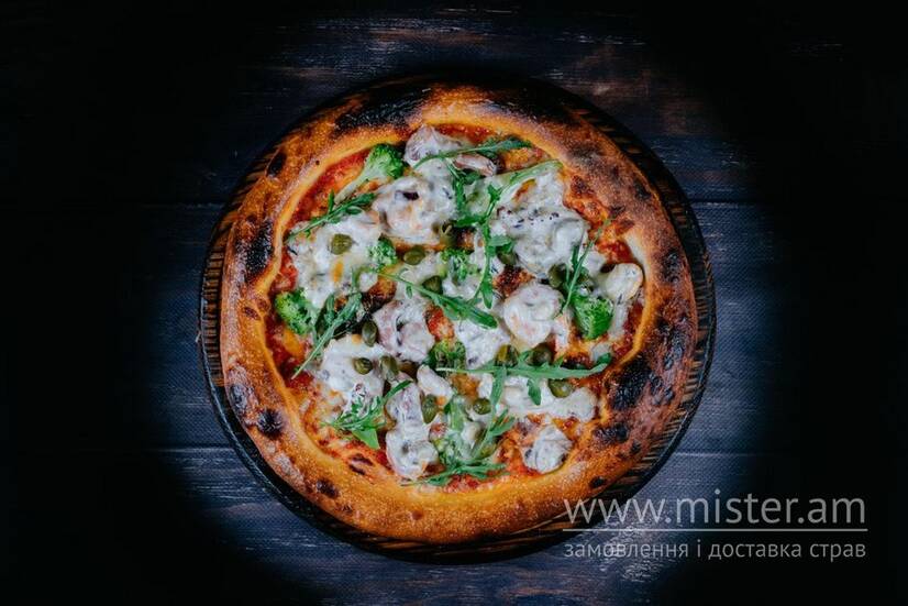 Соус томатний, мікс з морепродуктів, лосось, каперси, рукола, броколі, моцарела та пармезан, подається з фірмовим соусом на основі анчоусів.