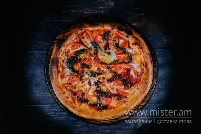 Томатний соус, моцарела, помідори, томати чері, в`ялені томати, сир халумі та пармезан, подається з томатною сальсою.