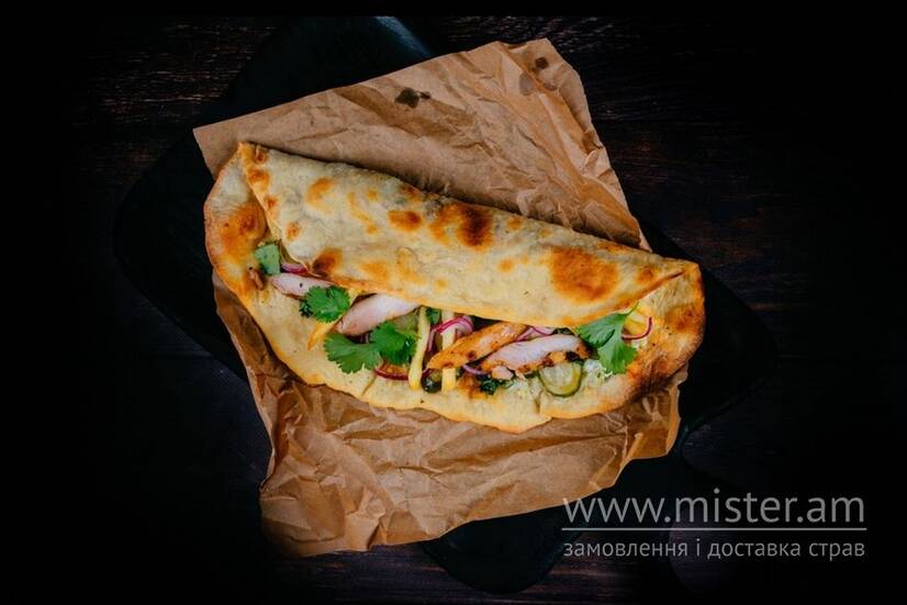 Піта з шашликом курки, маринована цибуля, солоний огірок, мікс салату, картопля фрі, соус мацоні.