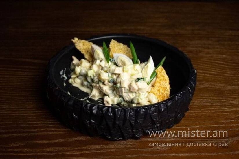 Картопля, горошок, огірок, куряче філе, соус цезар, зелена цибуля.