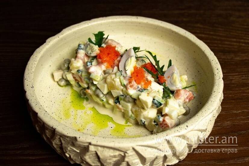 Картопля, горошок, огірок, лосось маринований, ікра тобіко, соус цезар, зелена цибуля.