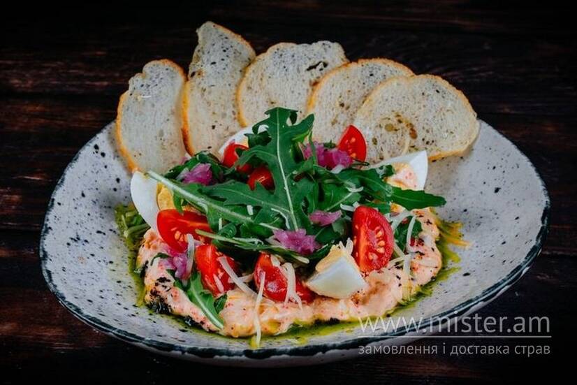 Цибуля червона маринована, рукола, рієт з запеченого лосося, куряче яйце, чері, пармезан та маслини.