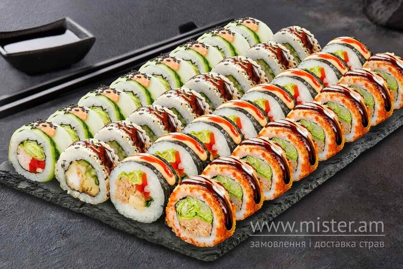 Кранч з тунцем, Роял Рол, Каліфорнія з креветкою в кунжуті, Футомакі з тунцем (гострий). Соєвий соус - 80 мл (2 шт). Імбир - 20 г. Васабі - 10 г.