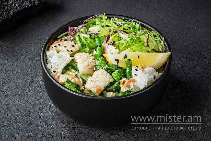 Рис, бульйон курячий, кальмари, гриб кораловий, спаржа, мікс салату, мікс імбир-часник, соус Ланч Кінг, соус Горіховий, лимон, кунжут.