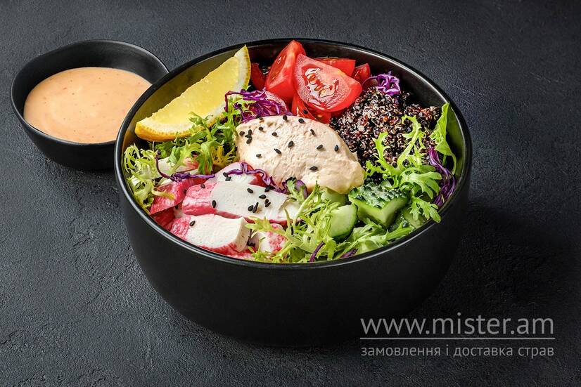 Крабові палички, кіноа, огірок, помідор, мікс салату, крем сир, соус Устричний, соус Азія BBQ, соус Ланч Кінг, соус Світ Чилі, лимон, кунжут.