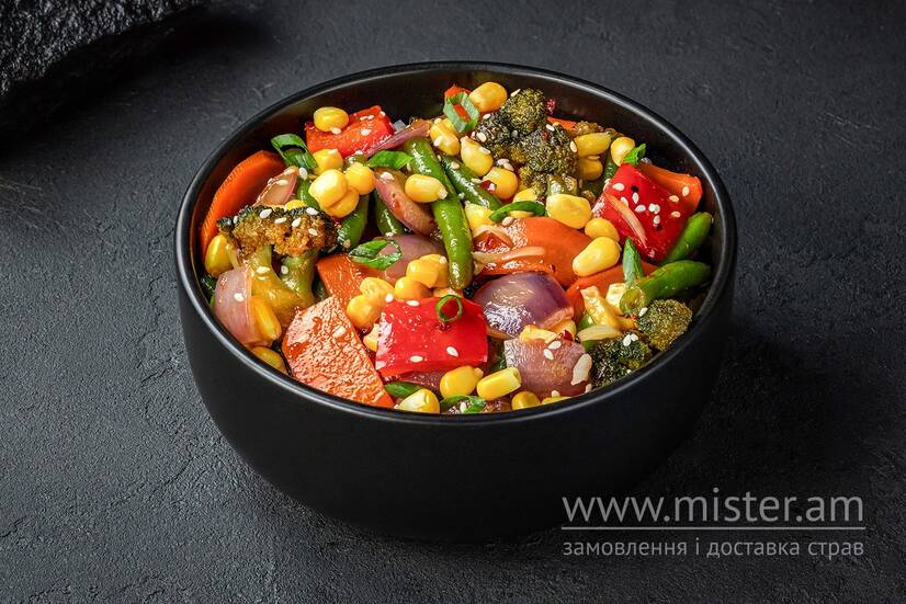 Рис, бульйон курячий, броколі, спаржа, перець болгарський, морква, цибуля синя, мікс імбир-часник, кукурудза, цибуля зелена, соус Пад Тай, кунжут.