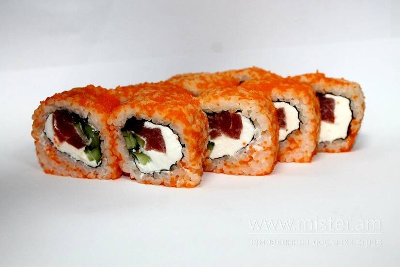 Рис, тунець, сир Філадельфія, огірок, ікра масаго.