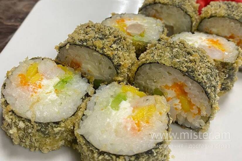 Рис, сир Філадельфія, креветки тигрові, манго, авокадо, ікра масаго.