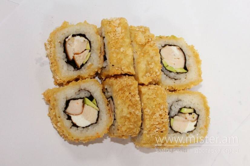 Рис, копчене куряче філе, сир Філадельфія, авокадо, ікра масаго.