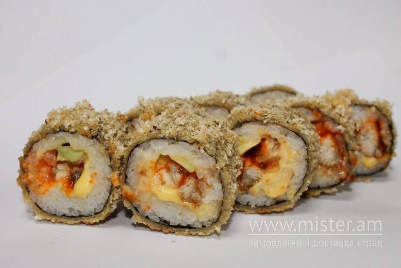 Рис, вугор, сир тостовий чедер, авокадо, ікра масаго.