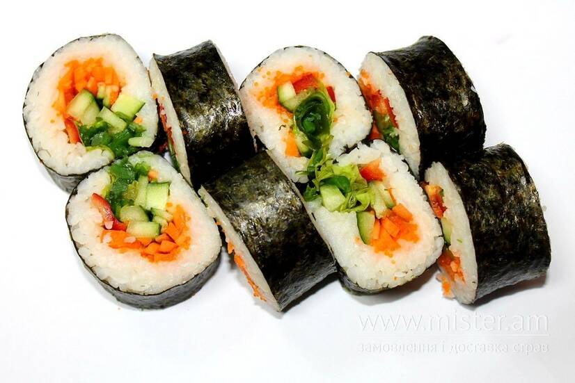 Рис, морква, чука, огірок, лист салата, перець солодкий.
