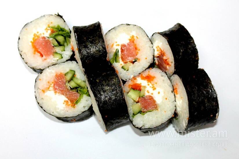 Рис, копчений лосось, сир Філадельфія, лист салата, огірок, ікра масаго.