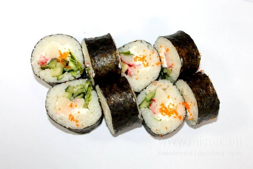 Рис, сніжний краб, сир Філадельфія, лист салата, огірок, ікра масаго.