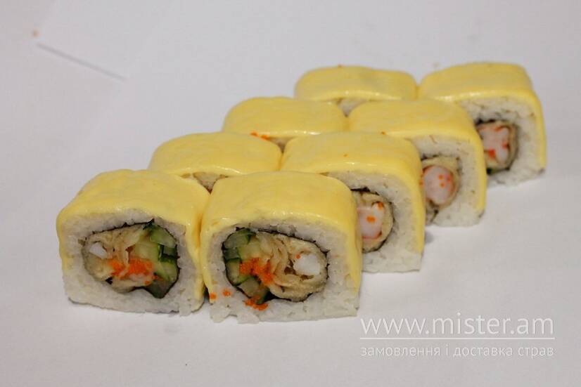 Рис, креветка в темпурі, огірок, ікра масаго, сир тостовий чедер.