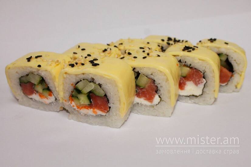 Рис, копчений лосось, сир Філадельфія, огірок, ікра масаго, сир тостовий чедер, кунжут.