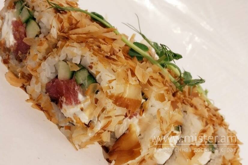 Рис, тунець, сир Філадельфія, огірок, стружка тунця.