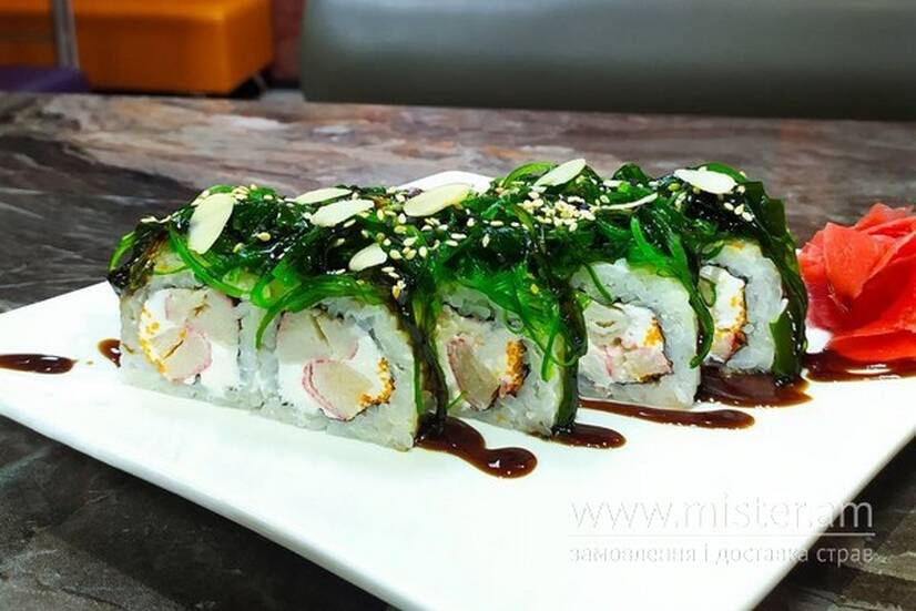 Рис, Крабові палички 2 шт., сир Філадельфія, ікра масаго, чука, соус унагі, кунжут, мигдальні пластівці.