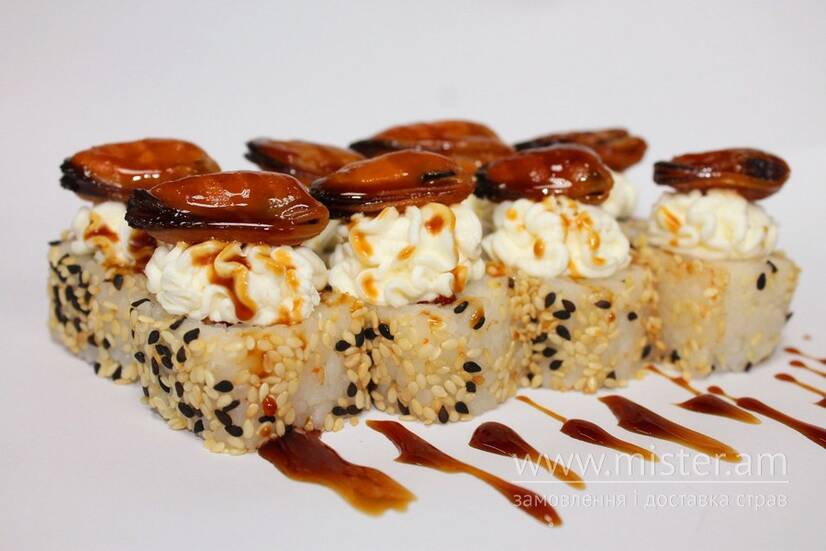 Рис, мідії, сир Філадельфія, огірок, солодкий перець, кунжут, соус унагі.