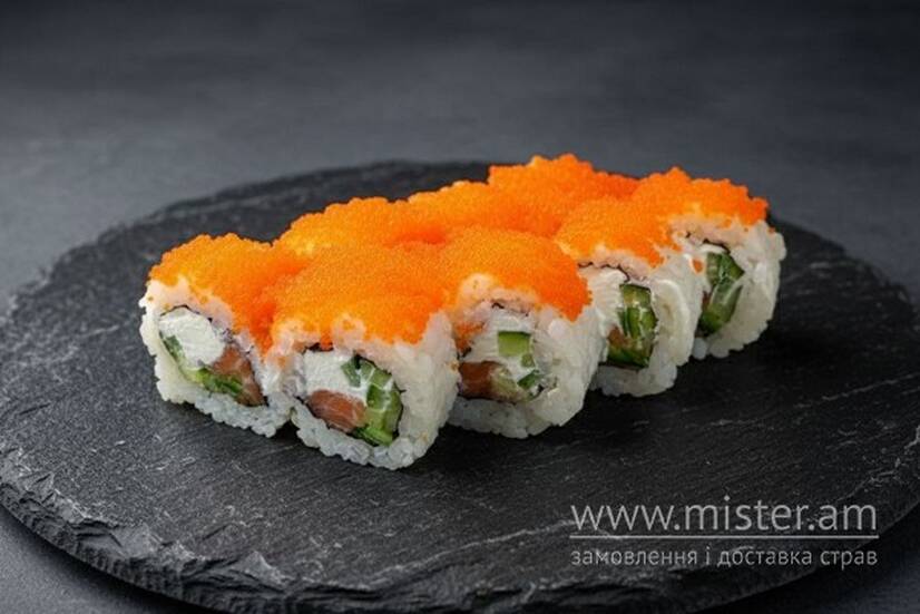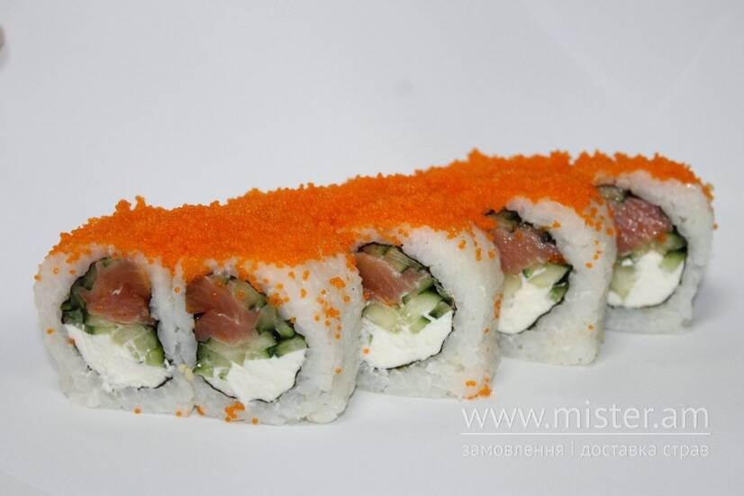 Рис, копчений лосось, сир Філадельфія, огірок, ікра масаго.