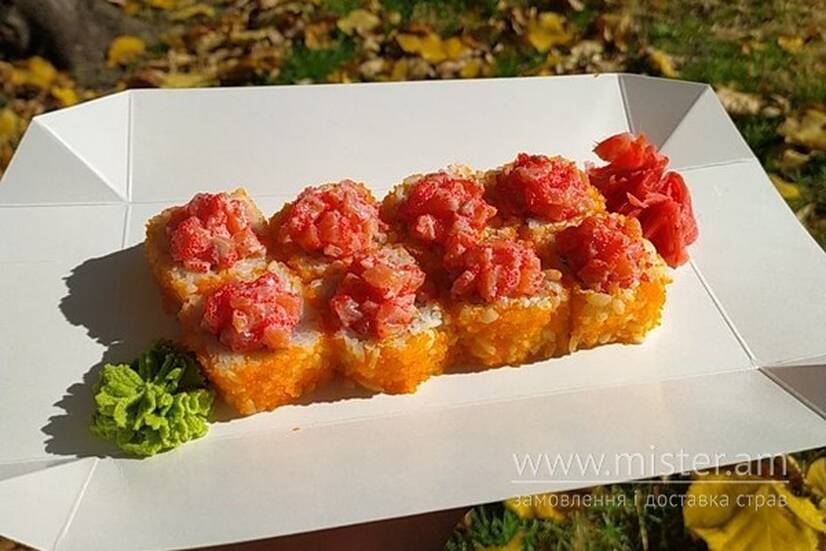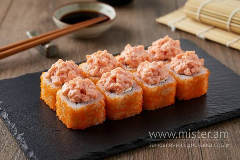 Рис, ікра масаго, сир Філадельфія, огірок, копчений лосось, соус чилі, майонез.