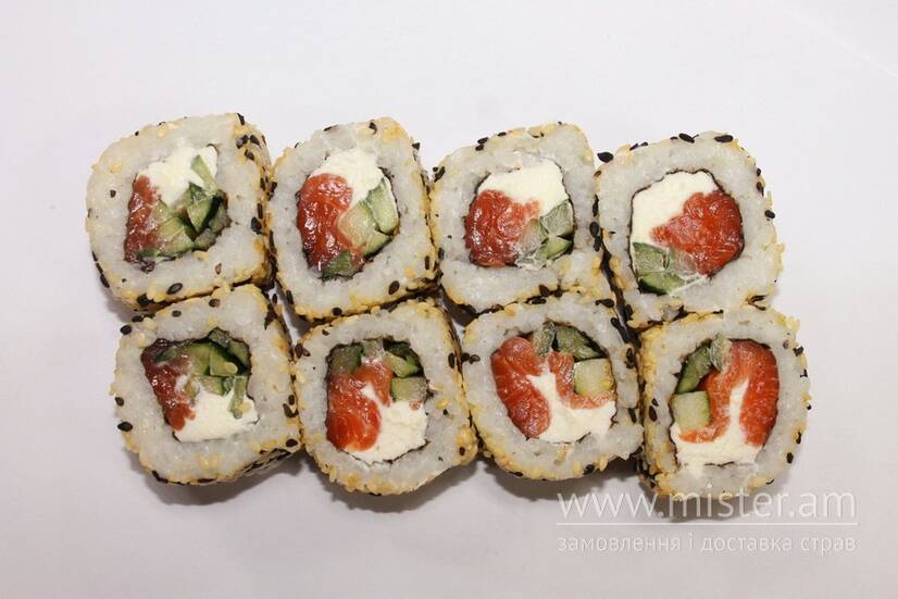 Рис, лосось, огірок, сир Філадельфія, кунжут.