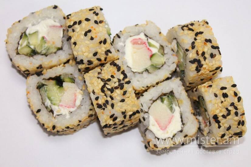 Рис, сніжний краб, огірок, сир Філадельфія, кунжут.