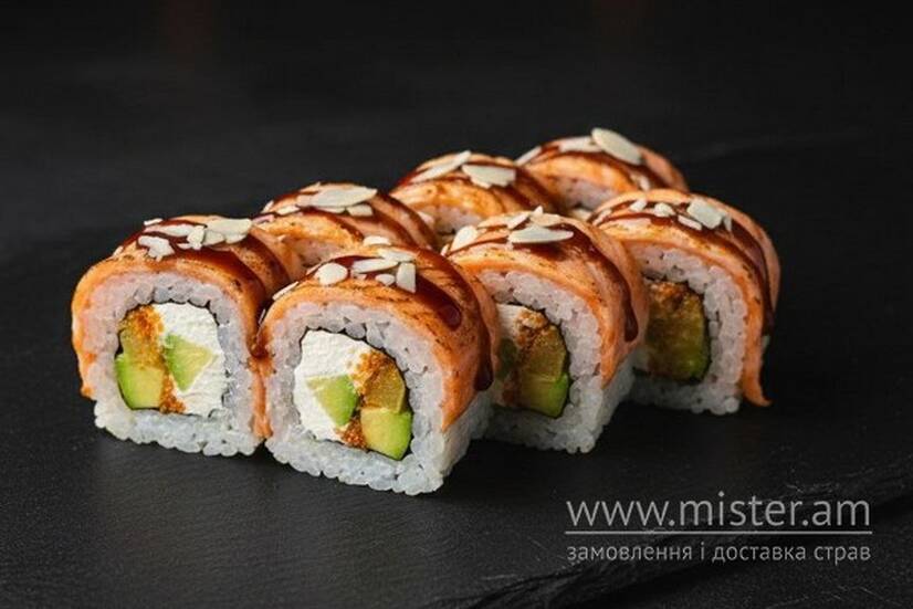 Манго, авокадо,ікра масаго, лосось гриль, сир Філадельфія, соус унагі, мигдаль.